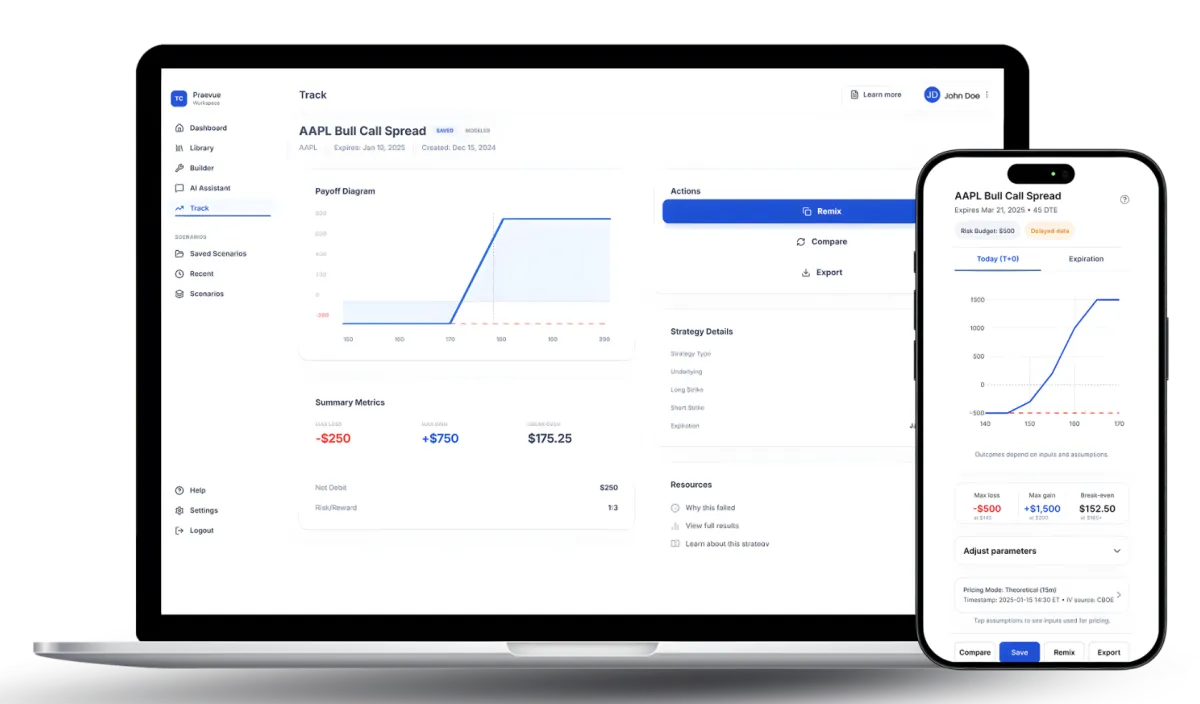 Praevue is an educational tool that helps you model options scenarios with clear assumptions and defined risk before committing capital.
