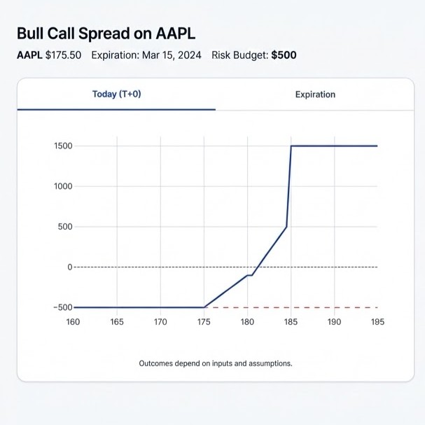Enter symbol, strikes, expiration, and quantity. All assumptions are shown as you build.